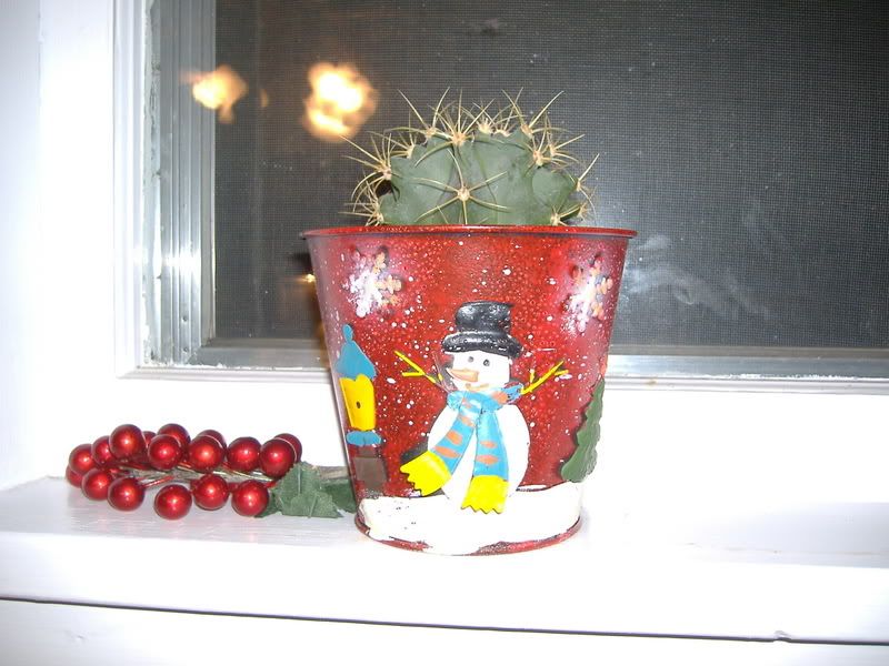 I have 3 cactus plants... all in the dining room windows. I found these wonderful little tin buckets at Loopy's for $1, so they all have one for the winter!